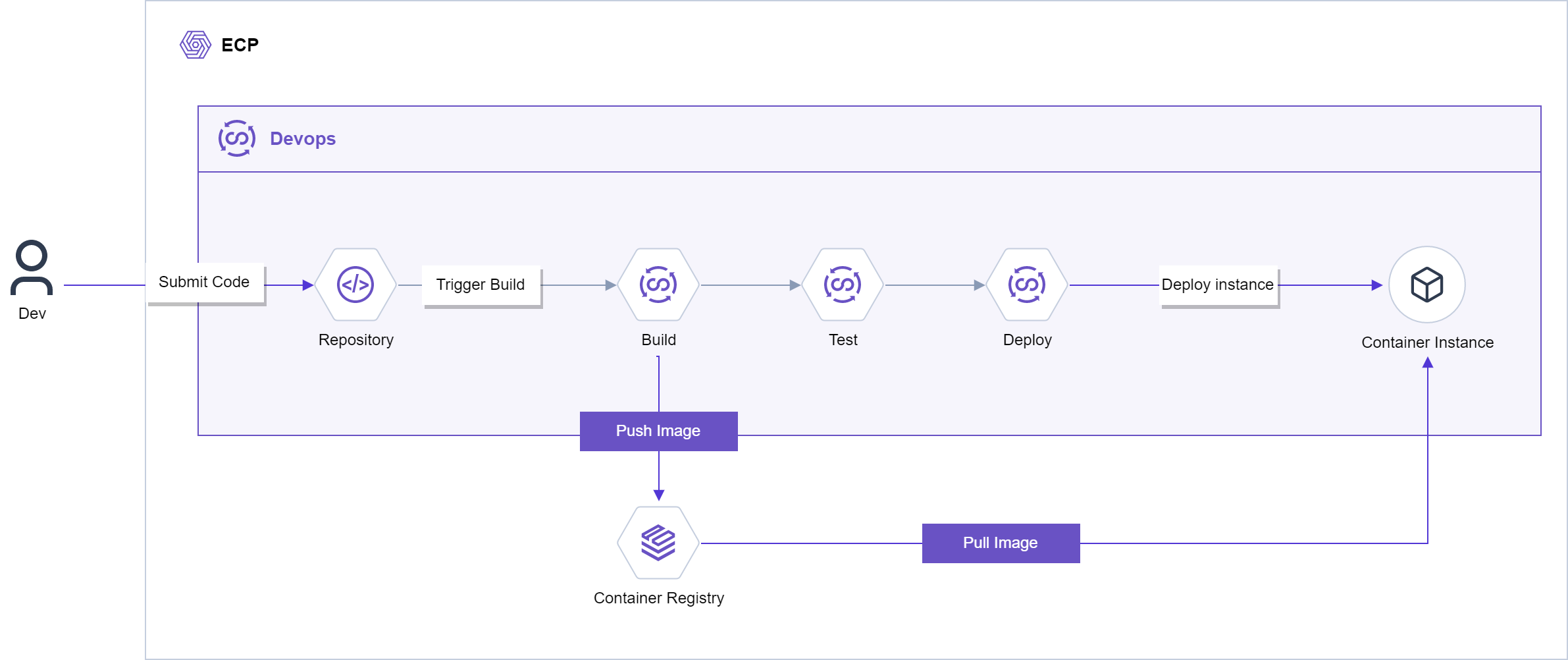 The DevOps pipeline relies on the cloud infrastructure platform to achieve an integrated design, unified permissions, monitor, log, and alarm capabilities.